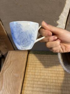 この作品は呉須を泡立てて白磁のマグカップの上に美しい模様を描いたものになります